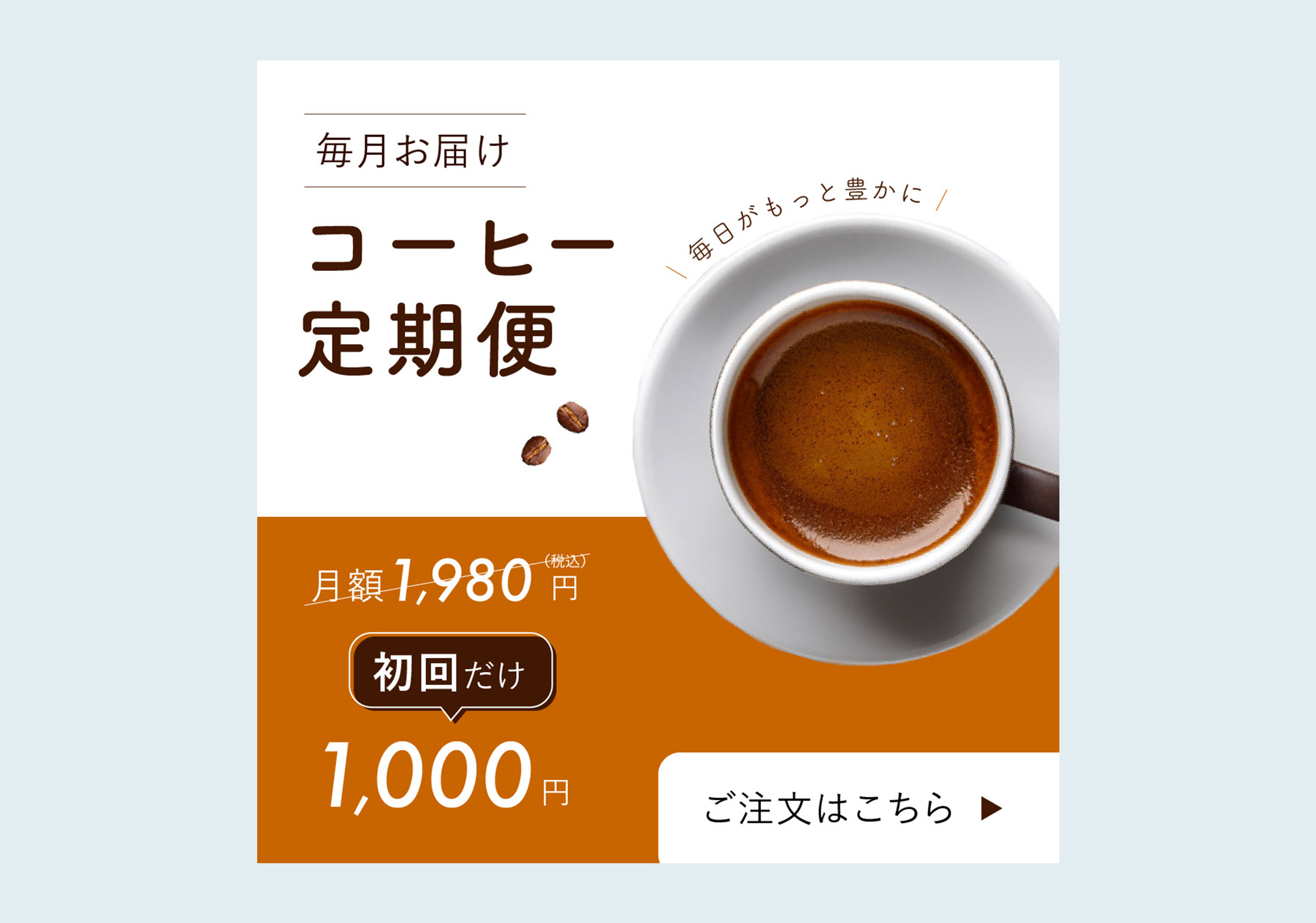 まず、何の広告かを理解してもらうために、「コーヒー定期便」というサービス名を一番大きく左上に配置しました。次に、「月額価格が初回だけ1,000円になる」という大事な情報を、吹き出しと上下の配置を活かして伝えました。