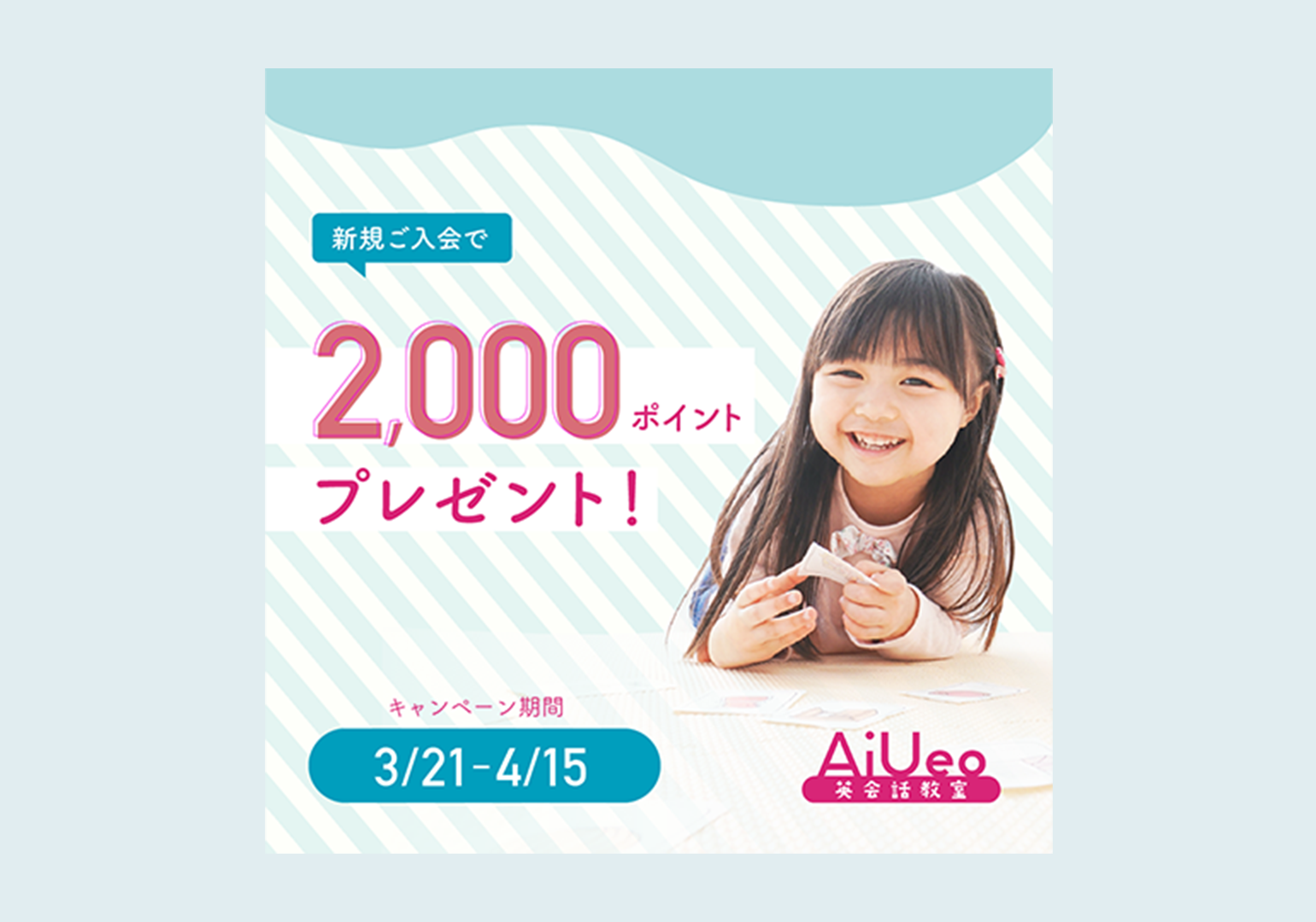 英会話教室の新規入会者に2,000ポイントがプレゼントされるキャンペーンを認知してもらい、入会を促進すること。